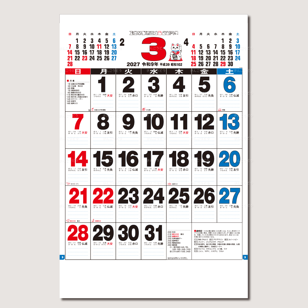 TD-690 3色A2文字月表(A/2切・13枚・608×425mm)