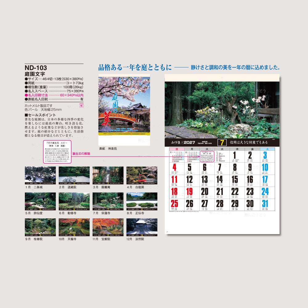 著名な庭園は、日本の多様な四季の変化を楽しむには最高の舞台。咲き誇る花、燃えるような紅葉などが美しさを倍加させます。庭の紹介などとともに、生活指標となる格言が添えられています。