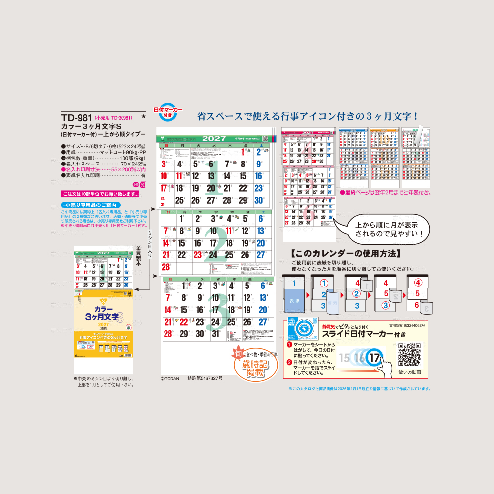 TD-981 カラー3ヶ月文字S(日付マーカー付)-上から順タイプ-(B/6切タテ・6枚・523×242mm)