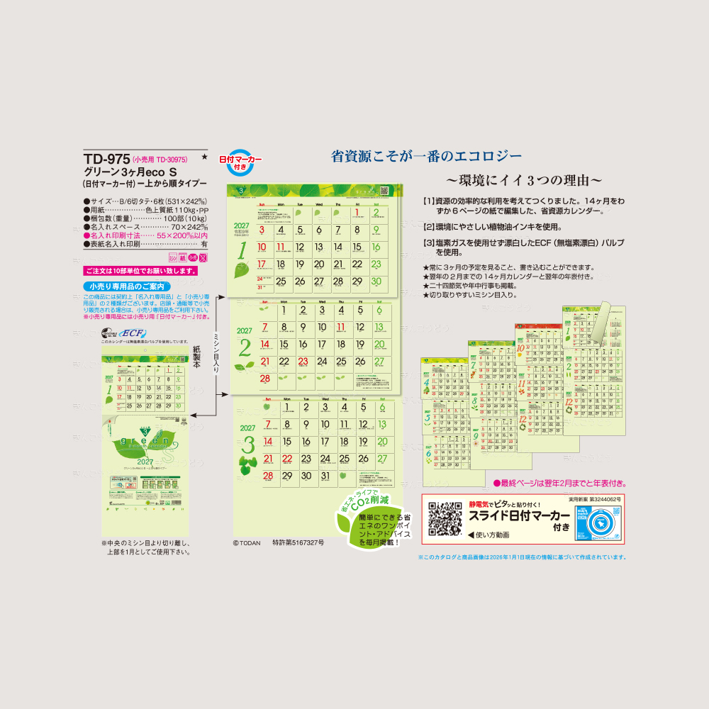 【TD-975】グリーン3ケ月eco S(日付マーカー付)-上から順タイプ-