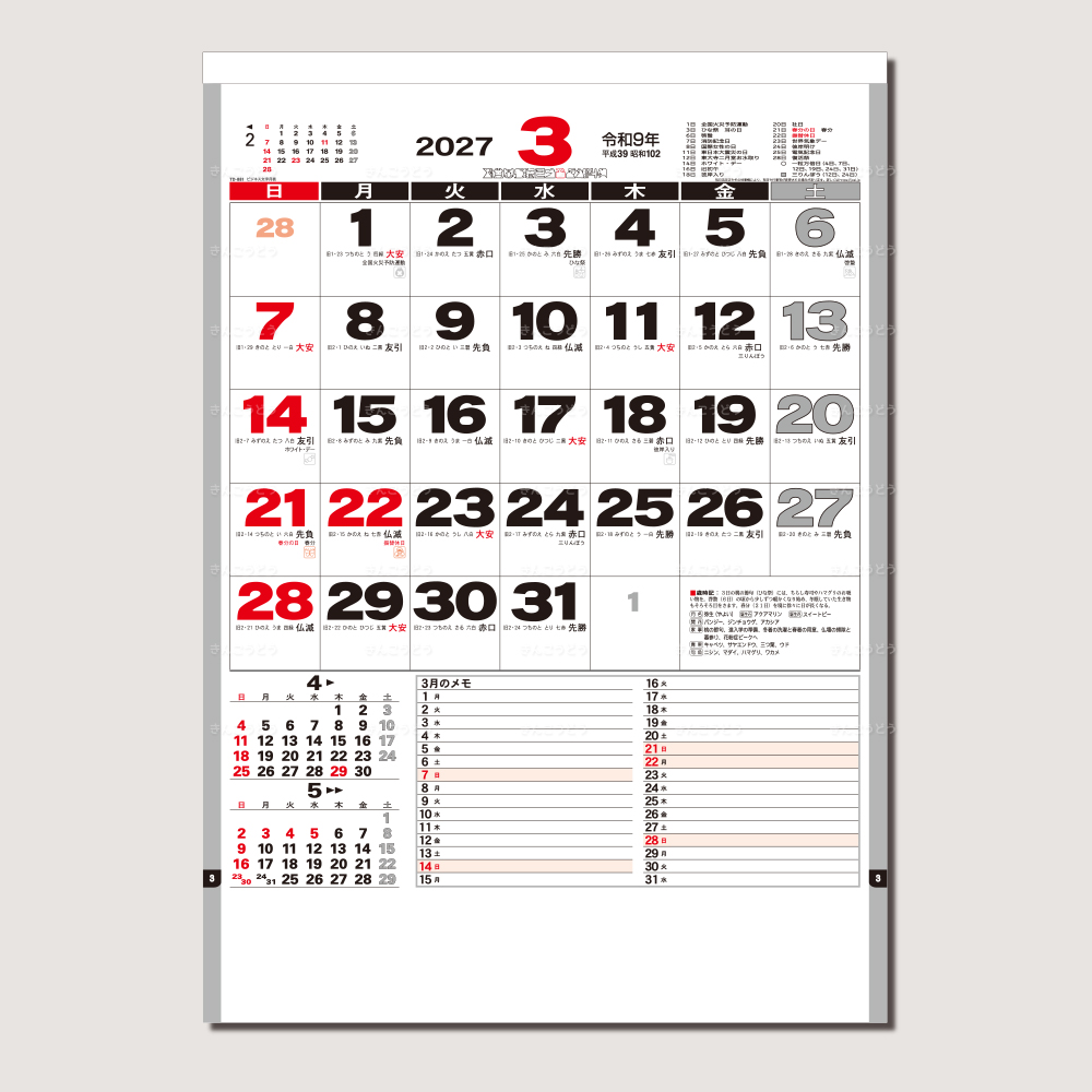 【3】長期スケジュールを立てやすい予定表メモ欄も毎月掲載。