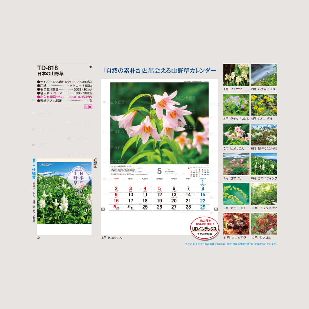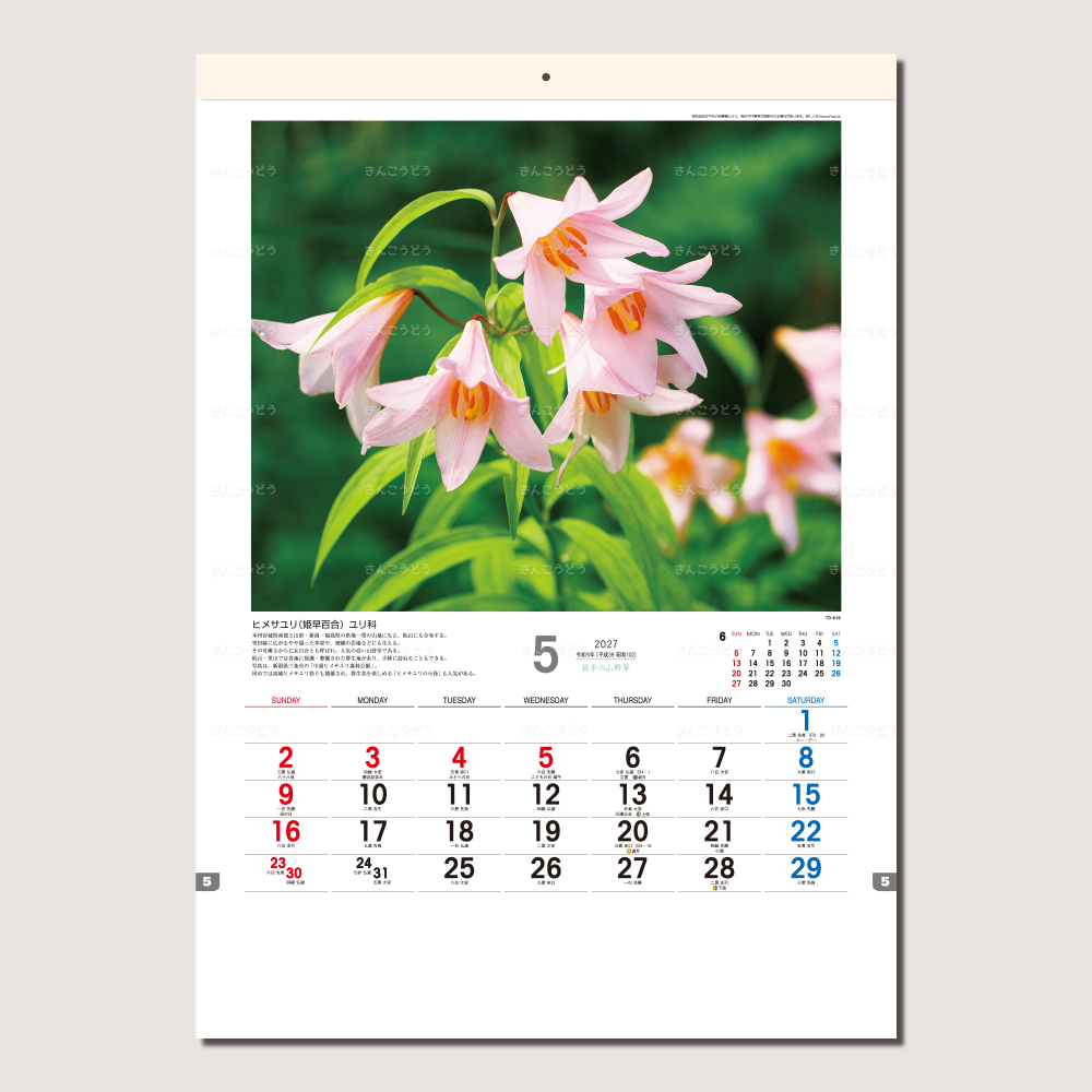 ●1月・フキノトウ ●2月・イワウチワ ●3月・ツクシ ●4月・オオスミミソウ ●5月・シロバナミヤマオダマキ ●6月・サラサドウダン ●7月・ハツユキソウ ●8月・キツネノカミソリ ●9月・トウヤクリンドウ ●10月・ホソバノヤマハハコ ●11月・コムラサキ ●12月・ダルマギク