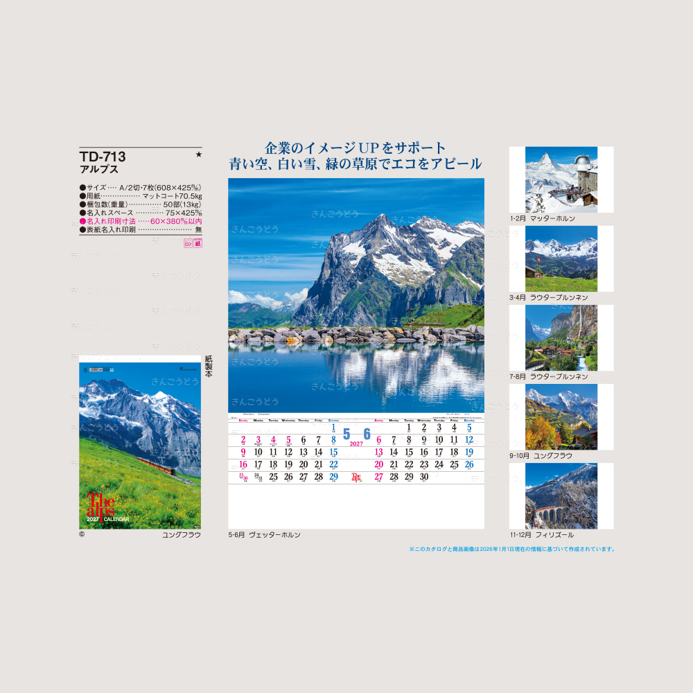 ●表紙・ユウグフラウ ●1-2月・マッターホルン ●3-4月・ラウターブルンネン ●5-6月・ヴェッターホルン ●7-8月・ラウターブルンネン ●9-10月・ユウグフラウ ●11-12月・フィリズール