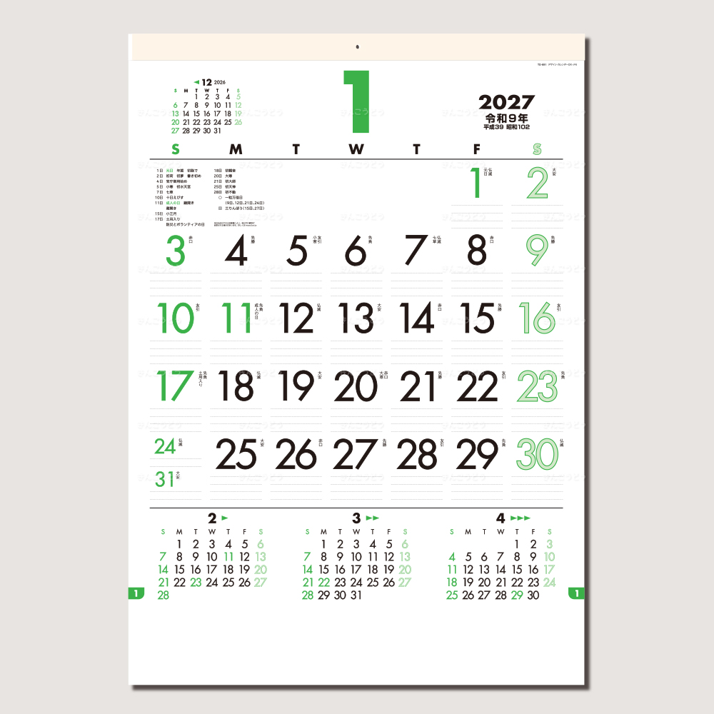 シンプルなデザインと色使いの実用性高いカレンダーです。日付は大きく見やすく、毎日にメモ罫線があり予定も書きやすい。先3ヶ月のミニカレンダーが付いているので未来の計画もしやすい、スッキリした見た目なのにしっかり使える優れものです。