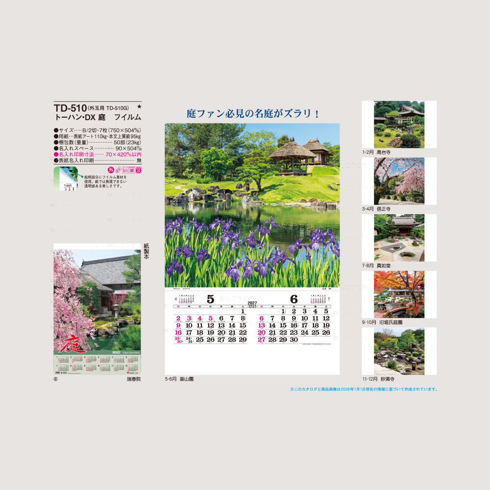 日本各地の四季折々の美しい庭風景を厳選したフィルムカレンダーです。紙では表現できない透明感のある美しい仕上がりは臨場感たっぷりです。木々や池、石や植物を配置し、様々な自然を表現する日本の情緒ある庭園をお楽しみください。