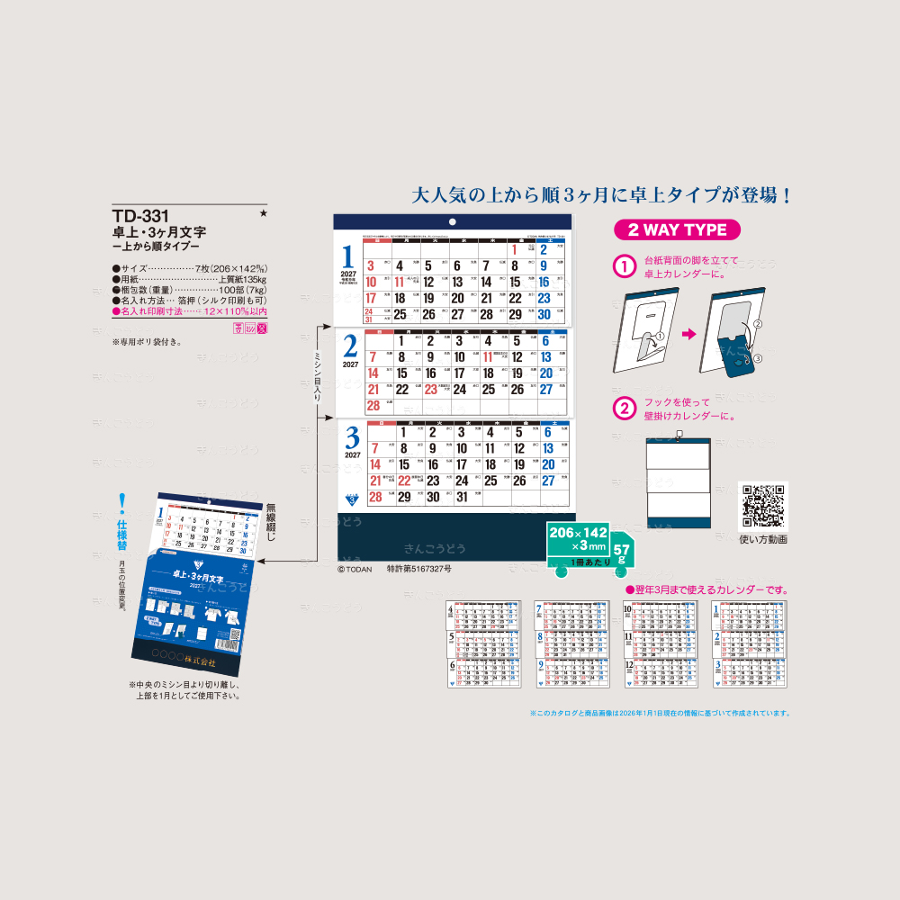 TD-331 卓上・3ヶ月文字 -上から順タイプ-(7枚・206×142mm)