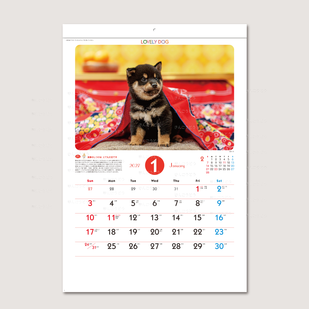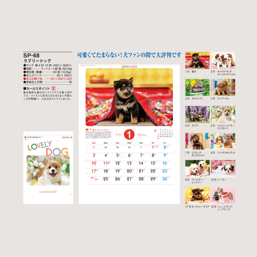 ●1月・ヨークシャー・テリア ●2月・ミニチュア・ダックスフンド ●3月・フレンチ・ブルドッグ ●4月・ビーグル ●5月・チワワ ●6月・秋田犬 ●7月・ポメラニアン ●8月・トイ・プードル ●9月・柴犬 ●10月・コーイケルホンディエ ●11月・シェットランド・シープドッグ ●12月・パピヨン